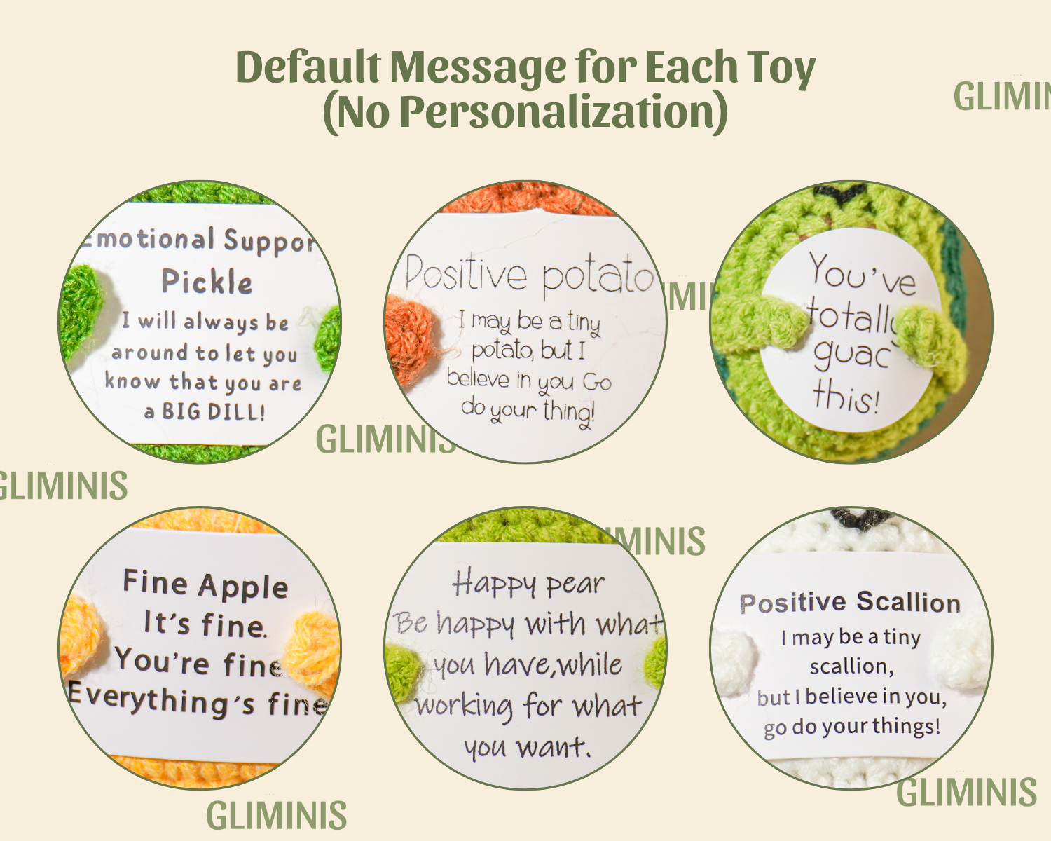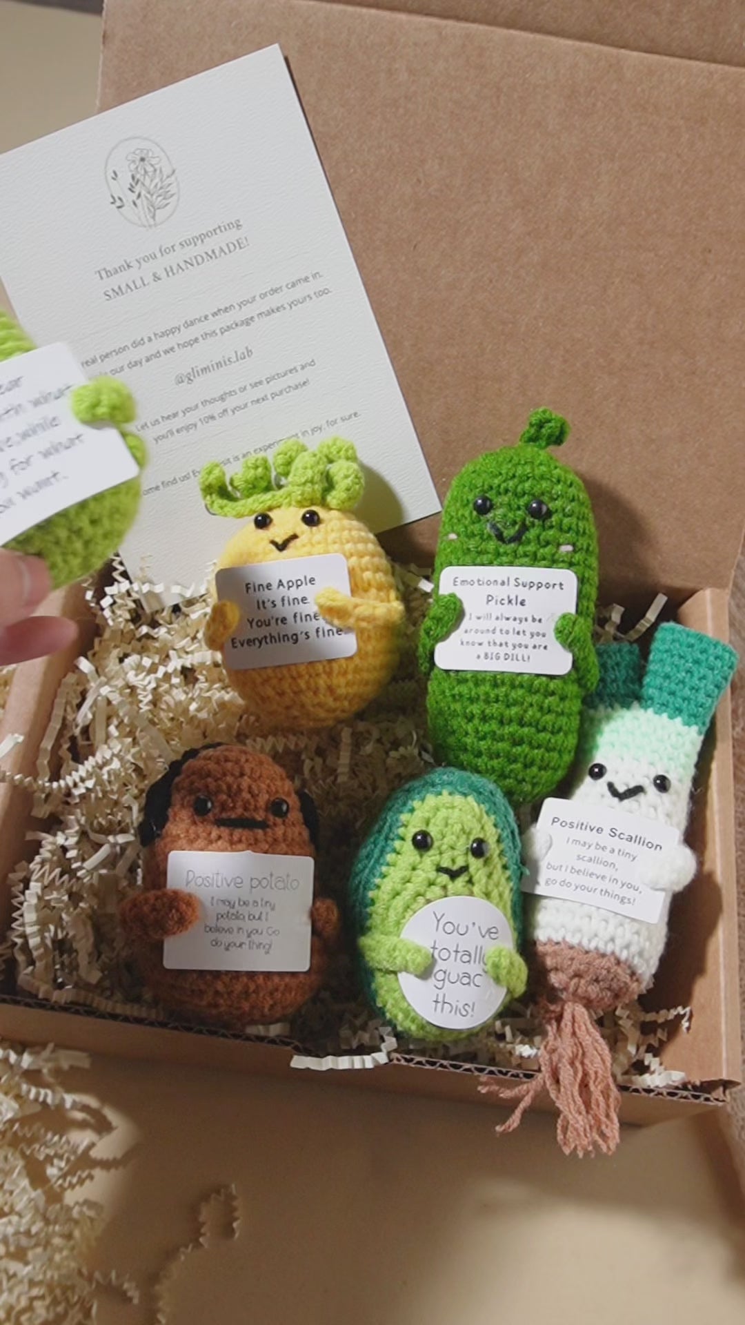 🌿 Adorable crocheted fruit and vegetable figures, each with a unique positive affirmation